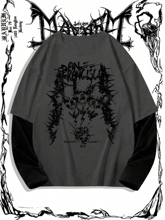 Men'S Casual Skull & Letter Print Colorblock Long Sleeve Mock Layer T-Shirt